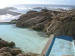 Das archaisch-brutalistische Betonbauwerk formt, wie eine Skulptur nahtlos in die Felsenlandschaft eingebettet, Bassins, die es ermöglichen, im Wasser des Atlantiks und dennoch geschützt vor der hier typischen tosenden Brandung zu baden. Dabei lässt sich betrachten, wie immer wieder größere Wellen in das Becken schwappen und das sonst ruhige, angewärmte Wasser ein wenig anregen und so dem künstlich geschaffenen Bad einen poetischen Hauch von Natur zurückgeben.