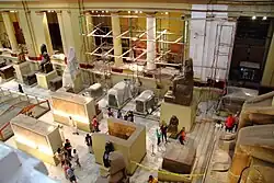 Nach der Eröffnung 1902 waren im Ägyptischen Museum ca. 50.000 Ausstellungsstücke zu sehen. Mit mehr als 150.000 Artefakten beherbergt es heute die größte Sammlung altägyptischer Kunst weltweit.[2] Die Ausstellung erstreckt sich über zwei Stockwerke mit über 100 Sälen. Im Erdgeschoss sind die Objekte nach den Epochen chronologisch geordnet, das heißt von der Prädynastik bis hin zur Griechisch-römischen Zeit sowie Funde aus nubischen Gräbern. Einen Sonderbereich innerhalb des Ausstellungsbereichs zum Neuen Reich nimmt die sogenannte Amarna-Gallery ein. Im 1. Obergeschoss befinden sich die Objekte, die ungestört oder nahezu ungestört aufgefunden wurden, also als geschlossener Fundkomplex präsentiert werden. Hier sind Fundstücke aus dem Grabschatz des Tutanchamun, Modell-Boote, Königsmumien, die Grabbeigaben von Juja und Tuja, die Mumienportraits aus dem Fayyum sowie Ostraka und Papyri ausgestellt.