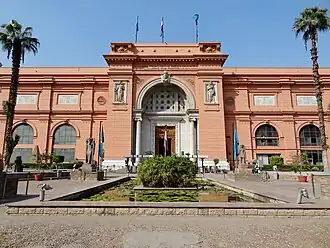 Die ägyptische Regierung gründete 1835 den Service des Antiquités de l’Egypte, um die weitere Plünderung archäologischer Schätze sowohl durch einheimische wie auch fremde Schatzsucher zu verhindern. „So entstand die erste, von der ägyptischen Regierung zusammengetragene Sammlung ägyptischer Kunstwerke.“ Die Sammlung fand zuerst ihren Platz in einem kleinen Gebäude im Esbekieh-Garten in Kairo und wurde später in die Saladin Festung überführt. 1858 eröffnete Auguste Mariette ein neues Museumsgebäude in Bulaq. Als im Jahr 1878 nach einer Überschwemmung des Museums in Bulaq viele Objekte fortgeschwemmt oder gestohlen worden waren, setzte sich Mariette besonders dafür ein, ein großes Museum für ägyptische Monumente zu errichten. Bevor der Khedive Ismail Pascha 1879 Ägypten verließ, ließ er die verbliebenen Sammlungen aus dem Bulaq-Museum in einen Anbau des Giza Palastes bringen, wo sie bis zur Eröffnung des Ägyptischen Museums im Jahr 1902 verblieben.[1] Die Grundsteinlegung zum neuen Museumskomplex im Stadtteil Midan al-Tahrir (Altstadt) erfolgte am 1. April 1897 in Gegenwart des Khediven Abbas Hilmi II. und dem Leiter des Service des Antiquités de l'Égypte, Gaston Maspero, der auch die Bauarbeiten mit überwachte. Die Bauzeit betrug vier Jahre und acht Monate und der Bau mit 15.000 m² Grundfläche kostete L. E. 240.000. Von Anfang März bis Mitte Juli 1902 wurden die Artefakte von Gizeh über den Nil nach Kairo gebracht. Am 15. November 1902 eröffnete Abbas Hilmi II das Ägyptische Museum.