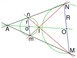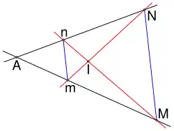 Eine Strecke MN kann wie im Bild der Durchmesser eines Kreises sein mit Mittelpunkt O mittig auf MN und Radius R=|ON|. Entsprechendes kann wie im Bild für eine zu MN parallele Strecke mn mit Kleinbuchstaben vereinbart werden. Für die Berechnung des äußeren Ähnlichkeitspunkts A und des inneren I der Strecken oder der Kreise können die Punkte in der xy-Ebene als Vektoren (x,y) oder als komplexe Zahlen (x+i·y) mit imaginärer Einheit i2=−1 benutzt werden. Dann gilt: