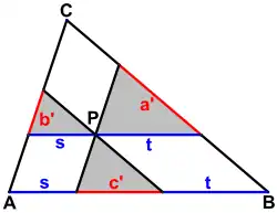 Gegeben seien ein Punkt innerhalb eines Dreiecks mit , und sowie die Parallelen durch zu den Dreiecksseiten. Diese Parallelen teilen jede Dreiecksseite in drei Abschnitte auf (siehe Planfigur).