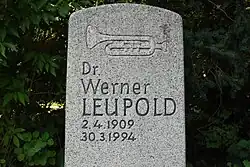 Grabmal „Dr. Werner Leupold“ mit Trompete auf dem Stadtfriedhof Engesohde