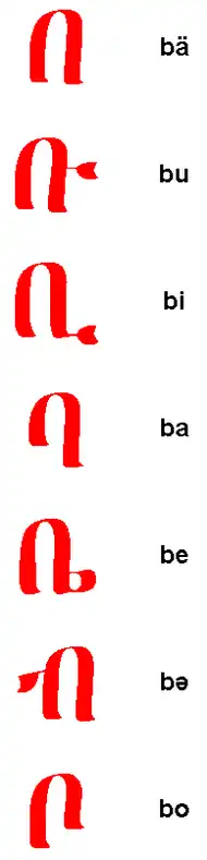 | Bet | b | በ | ቡ | ቢ | ባ | ቤ | ብ | ቦ | ቧ | |