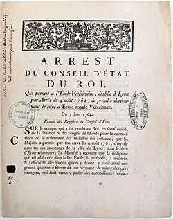 Die ENVL wurde auf Beschluss des königlichen Rates vom 4. August 1761 auf Initiative von Claude Bourgelat und der Bewilligung von Henri Bertin, Finanzminister von Ludwig XV., als École vétérinaire de Lyon gegründet. Ursprünglich sollte die Einrichtung am 1. Januar 1762 eröffnet werden. Es wurde aber kein geeigneter Ort gefunden und auch das Interesse potentieller Studenten war gering. Schließlich wurde im Juni 1762 eine alte Herberge erworben und unter Leitung des Architekten Melchior Munet umgebaut. 1764 wurde ein Teil der Schule durch ein Unglück zerstört. In diesem Jahr erging auch der Beschluss, die Einrichtung in École royale Vétérinaire umzubenennen. 1777 waren die Arbeiten soweit abgeschlossen, dass die ersten Studenten aufgenommen werden konnten. Am 25. April 1795 wurde die Hochschule in ein während der Französischen Revolution beschlagnahmtes Kloster (Clos des Deux-Amants) verlegt.