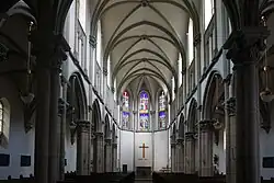 Das Mittelschiff und die Seitenschiffe sind durch Arkaden geteilt. Deren Rundbögen sind von profilierten Pfeilern mit figürlich behauenen Kapitellen gestützt. Darüber überbrückt ein Triforium die Wandfläche bis zu den Spitzbogen-Fenstern des Obergadens. Der oktogone Chor wird von fünf Spitzbogenfenstern mit einfachem Masswerk erhellt. Die Fensterhöhe setzt die Reihe der Triforien und Obergadenfenster fort. Zwischen den Fenstern gliedern Wandpfeiler die Wände. Als Fortsetzung der Pfeiler stützen Pilaster mit aufgesetzten Kämpfern das Kreuzrippengewölbe ab.