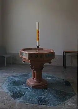 Am westlichen Anfang des rechten Seitenschiffs musste beim Bau der Kirche auf Verlangen des kritisch-ablehnend eingestellten Kantonsbaumeisters Friedrich Salvisberg eine Seitentüre eingebaut werden. Dort wurde 1912 ein vom Architekt Hardegger entworfener Taufstein in rotem Veroneser Marmor aufgestellt. Als Einlagen wurde grüner Serpentinit verarbeitet, der auch beim jüngsten Umbau für den achteckigen Plattenboden um den Sockel verwendet wurde. Bei der jüngsten Renovierung 2007 der Kirche wurden die Türe durch ein Kunstglasfenster ersetzt und ein eigenes Baptisterium geschaffen. Das Fenster gestaltete der Künstler Michel Delanoë (* 1945 in Caen) aus Serix VD in weisslichem Glasschliff.