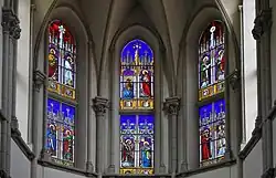 Die drei hohen Fenster im Chor waren 1866 von Johann Jakob Röttinger nach der Art der Nazarener gemalt worden. Sie stellen im mittleren Fenster die Verkündigung an Maria und die Schlüsselübergabe an Petrus dar. Weiter sind im linken Fenster die vier Evangelisten und rechts die vier Kirchenväter Augustinus, Ambrosius, Hieronymus und Papst Gregor der Grosse. Die Fenster der Seitenschiffe wurden 1942 von Albin Schweri mit Bildern besonders von Schweizer Heiligen bemalt. Zwei Bilder der Hl. Cäcilia und des Hl. Benedikt, gemalt von Frauenknecht Firma Scheidegger Freiburg, kamen 1980 dazu. Zuletzt entstand noch die ungegenständliche Verglasung in der Taufkapelle 2007 von Michel Delanoë.