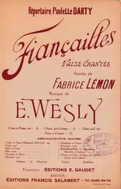 - Fiançailles („Flitterwochen“). Walzer mit Gesang. Text: Fabrice Lémon. 1900.[20] Tonaufnahme bei Odeon für den deutschsprachigen Markt mit Julius Schmidt (Violine) und R. Tichy (Klavier)[21] Klavierstimme auf ismlp.org