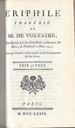 - Ériphyle, tragédie de M. de Voltaire. Représentée par les Comédiens ordinaire du Roi, le Venredi 7 mars 1732. Pièce que l'auteur s'ètoit opposé qu'elle fût imprimée de son vivant. Prix 36 Sols, Paris, 1779, 82 S.[1]
