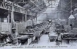 Die Établissements Julien Lévy siedelten sich um 1909 in Juvisy am 65 Quai Jean Pierre Timbaud zwischen der Seine und den Eisenbahngleisen an der Grenze zwischen Juvisy und Athis-Mons an.[1] Eine mit einer Decauville-Lokomotive N° 354/1902 Les Deux Sœurs betriebene Feldbahn mit einer Spurweite von 600 mm entlang der Rue Viry besorgte den innerbetrieblichen Transport. Die Feldbahn war Teil des Netzwerks der Mühlsteinbrüche des Waldes von Séguigny und Umgebung, das von unterschiedlichen Unternehmern mit unterschiedlichen Spurweiten betrieben wurde.[2]