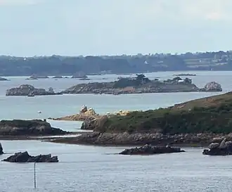 - Photographie der Gegend auf survoldefrance.fr (Teile der Île Verte am Bildrand unten rechts: die weißen Punktreihen daneben sind die Schwimmer der nahen Algenzucht)
