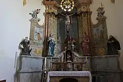 Besonders wertvoll ist die einheitliche Barockausstattung von 1762. Der aus Sandstein gefertigte Hochaltar zeigt die Kreuzigung Christi in einem mit Holz gefasstem lebensgroßem Kruzifix, umgeben von Martha und Maria Magdalena, Maria und Johannes. Auf der linken Außenseite wird das Opfer Abrahams, daneben die Statue des hl. Paulus von Theben mit dem Raben, rechts Moses mit der ehernen Schlange, daneben die Statue des hl. Antonius, dargestellt. Davor befindet sich der Altartisch mit dem darunter eingefassten hl. Grab, sowie einem Rokoko-Tabernakelaufsatz, sowie einer bekleideten Mariazeller Madonna.