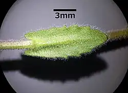 Die Laubblätter sind wechselstängig am Stängel angeordnet. Die Grundblätter sind nicht in Rosetten angeordnet und mit einer Länge von 2 bis 10 Millimetern kurz gestielt.[2][4] Ihre Blattspreite ist bei einer Länge von 1 bis 2,5 (0,5 bis 3) Zentimetern sowie einer Breite von 3 bis 15 Millimetern spatelförmig, verkehrt-eiförmig oder länglich-eiförmig mit keilförmiger Basis, gezähntem oder fast leierförmigem, manchmal fast glattem Rand und stumpfem oder spitzem oberen Ende.[4] Die 5 bis 15 Stängelblätter sind mehr oder weniger behaart und bewimpert und weisen einen herz- oder pfeilförmigen Grund mit zwei gerundeten, halbstängelumfassenden Öhrchen auf;[1][5] sie sind klein gezähnt[6]. Die mittleren Stängelblätter sind sitzend und liegen dem Stängel fast an. Ihre Blattspreite ist bei einer Länge von 1 bis 2 (0,5 bis 2,5) Zentimetern sowie einer Breite von 2 bis 10 Millimetern eiförmig, länglich oder elliptisch mit geöhrter oder stängelumfassender Basis, gezähntem oder glattem Rand.[4]