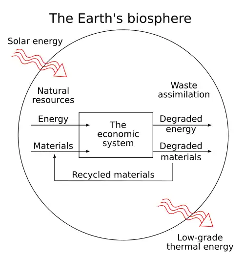 Als Ökologische Ökonomie werden insbesondere in den 1980er Jahren entstandene Ansätze zur Erneuerung der Umweltökonomik bezeichnet. Sie bezieht sich auf Arbeiten von Ökologen wie C. S. Holling und Paul R. Ehrlich. Die „traditionelle“ Umweltökonomik basiert im Wesentlichen auf der neoklassischen Theorie und versteht Umweltprobleme hauptsächlich als fehlerhafte Ressourcenallokation aufgrund externer Effekte. Die Ökologische Ökonomie wendet sich gegen diese rein ökonomische Betrachtungsweise und versteht sich demgegenüber transdisziplinär.[1] Zum Beispiel wird im deutschsprachigen Raum versucht, im Rahmen der sozial-ökologischen Forschung auch auf die gesellschaftlichen Bedingungen einzugehen. Ökologische Grenzen der Wirtschaft werden anhand eines geschlossenen Systems dargestellt.[2] Zur Bestimmung der Wachstumsgrenzen werden beispielsweise die thermodynamischen Grundbedingungen von Produktion und Konsum auf dem „Raumschiff Erde“[3][4] betrachtet. Welche Elemente des Naturkapitals in welchem Umfang durch produziertes Kapital auf dem Weg zu den Grenzen des Wachstums ersetzt werden können und dürfen, ist ein wichtiges Arbeitsgebiet der Ökologischen Ökonomik.