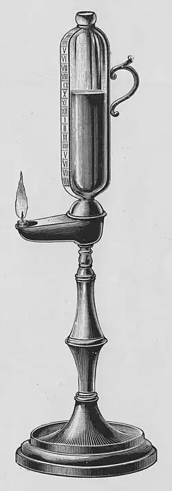 Füllte man abends den Ölbehälter voll und zündete die Lampe an, so hatte man während der ganzen Nacht nicht nur Beleuchtung, sondern auch annähernd die Zeitanzeige. Durch den Brennstoffverbrauch der Lampe sank der Öl- oder Transpiegel im Glasreservoir, wodurch man auf der Skala die Zeit abgelesen konnte. Weil der Druck des Öles in Abhängigkeit vom Pegel einen ungleichmäßigen Verbrauch verursachte und die Stundenskalen am zylindrischen Behälter meistens linear angezeigt wurden, war die erste Abendstunde viel kürzer als die letzte Morgenstunde. Um das auszugleichen, bekam der Ölbehälter später die Form einer umgedrehten Birne. Durch diese Maßnahme konnte man die Längen der Stunden annähernd gleich halten.