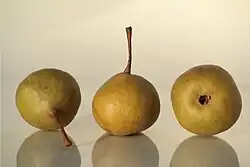 Die kleinen, langgestielten Früchte sind variabel geformt, von kreiselförmig über kugelig bis flachgedrückt, oft auch unförmig. Im reifen Zustand sind sie hellgrün bis gelb, sonnenseitig färben sie sich rötlich braun. Die Früchte sind fest und werden erst mit fortschreitender Reife druckanfällig. Das feste, weißgrünliche Fruchtfleisch ist saftig, süß und aromatisch, zugleich gerbsäurehaltig. Die trockene, samtig raue Schale stört etwas beim Verzehr. Die reifen Früchte fallen vom Baum, sodass sie nicht gepflückt, sondern nur noch aufgesammelt werden müssen. Kühl gelagert sind die Früchte bis ins Frühjahr haltbar.