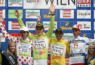 Siegerehrung, v. l. n. r.: Leonardo Bertagnolli (Sieger der Gesamt-Bergwertung), André Greipel (Sieger der Gesamt-Punktewertung), Michael Albasini (Gesamtsieger) und Stefan Denifl (bestplatzierter Österreicher)