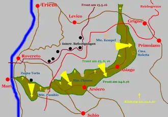Der mittlere Angriffsabschnitt stieß mit dem XX. und dem III. Korps über die Hochfläche der Sieben Gemeinden über die, bereits von der Artillerie zerstörten, italienischen Befestigungswerke Forte Monte Verena und Forte Campolongo vor, (am 16. Mai abends erreicht das 1. Regiment der Tiroler Kaiserjäger in der Nähe des Pinovernarückens die Reichsgrenze) eroberte den Monte Cimone (Infanterieregiment Nr. 14)[20] und die Kleinstädte Asiago (Becken von Asiago)[21] und Arsiero, konnte jedoch nur bis auf eine Linie bis kurz vor den beiden Ortschaften vorankommen. Kampflos eingenommen werden konnten in diesem Abschnitt die Befestigungswerke Caserma Interrotto und Forte Casa Ratti. Bei letzterem entbrannte ein Streit zwischen dem Sappeurbataillon 14 und dem Infanterieregiment Nr. 50, wer als erster in dem Fort gewesen sei. Das AOK entschied dann zugunsten der Sappeure. Am 1. Juni wurde der Monte Cengio erstürmt, die Truppen und standen damit am Rande der venetianischen Ebene, deren Zugang nur noch durch das Massiv des Monte Paù versperrt wurde.
