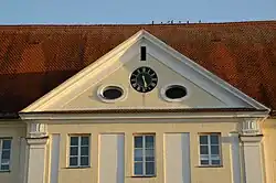 Der dreigeschossige Walmdachbau mit übergiebeltem Mittelrisalit und Putzgliederung mit Eckpilastern wurde nach Plänen von Joseph Dossenberger errichtet. Das frühklassizistische Bauwerk aus Backsteinen besitzt elf zu vier Fensterachsen. Das Erdgeschoss auf niedrigem Sockel ist mit einer Streifenrustika versehen.