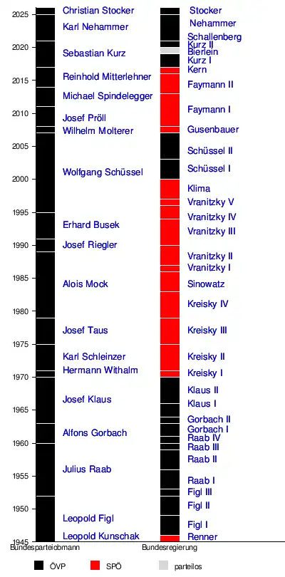 Die ÖVP stellte seit 1945 in 15 von 32 Bundesregierungen den Bundeskanzler, von 1945 bis 1970, von 2000 bis 2007 sowie seit 2017 (mit kurzer Unterbrechung durch Expertenregierung Bierlein). ÖVP-Bundeskanzler sind beziehungsweise waren: Leopold Figl, Julius Raab, Alfons Gorbach, Josef Klaus, Wolfgang Schüssel, Sebastian Kurz, Alexander Schallenberg, Karl Nehammer und der aktuelle Amtsinhaber Christian Stocker. Fünf der insgesamt neun Landeshauptleute Österreichs (in Niederösterreich, Oberösterreich, Salzburg, Tirol und Vorarlberg) sind Mitglied der ÖVP; zudem ist sie Teil der Landesregierungen von der Steiermark und Kärnten. Seit der Bundesregierung Vranitzky II (1987) war die ÖVP bis zur Enthebung der Bundesregierung Kurz I im Jahr 2019 ohne Unterbrechung in der Bundesregierung vertreten. Die Volkspartei stellte mit Franz Fischler, Benita Ferrero-Waldner, Johannes Hahn und Magnus Brunner alle österreichischen EU-Kommissare. Mit Kurt Waldheim und Thomas Klestil wurden zwei ihrer Kandidaten zum Bundespräsidenten gewählt und amtierten insgesamt 18 Jahre.