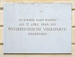 Die ÖVP wurde als inoffizielle Nachfolgepartei der CS am 17. April 1945 im Schottenstift (Schottenhof, 1. Bezirk) in Wien durch Leopold Kunschak (Obmann), Hans Pernter (geschäftsführender Parteiobmann), Lois Weinberger, Leopold Figl, Julius Raab und Felix Hurdes (Generalsekretär) gegründet.