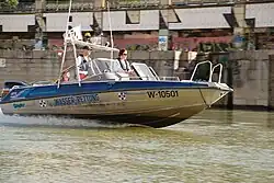 Fiskars Buster Magnum Einsatzboot der ÖWR LV Wien vor dem Flex im Zuge des Euro-2008-Einsatzes