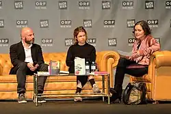 Der Gewinner des Jahres 2018 Daniel Wisser und die Gewinnerin des Debütpreises Marie Gamillscheg auf der Buch Wien 18