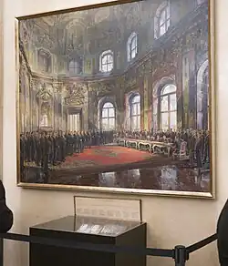 Unterrichtsminister Heinrich Drimmel erteilte dem Maler Sergius Pauser den Auftrag, die Unterzeichnung des Staatsvertrags auf einem Ölgemälde festzuhalten. Pauser war daher bei der Unterzeichnung anwesend und machte bereits erste Skizzen. Seine Ölskizze fand zwar die Zustimmung Drimmels, jedoch nicht die von Bundeskanzler Julius Raab, der ein Gemälde wollte, auf dem die einzelnen Personen zu erkennen waren. Raab erteilte daraufhin den lukrativen Auftrag an den Maler Robert Fuchs, der im Gegensatz zu Pauser während der nationalsozialistischen Zeit Mitglied der NSDAP gewesen war. Fuchs’ Gemälde „Die Unterzeichnung des österreichischen Staatsvertrags im Oberen Belvedere 1955“ wurde erst 1957 fertig und hängt im Bundeskanzleramt. Die künstlerisch wertvollere Ölskizze von Pauser befindet sich heute in den Landessammlungen Niederösterreich. Fuchs musste in seinem Gemälde auch Eitelkeiten bedienen und bekam genau vorgeschrieben, welche Personen darauf zu sehen sein müssten, unabhängig von der tatsächlichen Anwesenheit. Zu sehen ist rechts der Tisch, an dem Außenminister Figl, umgeben von den Außenministern der vier Großmächte und deren Botschaftern in Wien, den Vertrag unterzeichnet. Links stehen die Mitglieder der Bundesregierung, in der Mitte und hinter dem Unterzeichnungstisch die in- und ausländischen Diplomaten und die Spitzen der österreichischen Beamtenschaft. Die ebenfalls beim Festakt anwesenden Chefredakteure und Auslandskorrespondenten kommen nicht vor. Der für den Auftrag an Fuchs zuständige Beamte war beim Staatsakt nicht anwesend, steht aber auf dem Gemälde direkt hinter Figl. In der Realität war das der Platz eines Beamten namens Rudolf Kirchschläger, von dem man damals aber natürlich noch nicht wissen konnte, dass er später einmal Bundespräsident von Österreich werden sollte. Auf dem Gemälde steht Kirchschläger ganz am rechten Rand, neben dem späteren Staatssekretär Ludwig Steiner; dieser war damals Kabinettchef von Raab und stand daher in der Realität neben Raab, war aber kein Freund des besagten Beamten.[24]