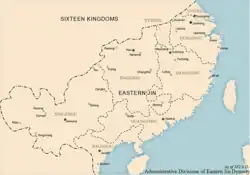 Die Hauptstadt der Östlichen Jin-Dynastie war das heutige Nanjing (damals wurde die Stadt Jiankang genannt). Das Territorium der Östlichen Jin-Dynastie war der mittlere und untere Lauf des Jangtsekiang. Gleichzeitig mit der Östlichen Jin-Dynastie gab es am mittleren und unteren Lauf des Gelben Flusses insgesamt 16 relativ kurzlebige, einander bekämpfende Staaten, deren Kaiser hauptsächlich von den nomadischen Völker aus Nord- oder Westchina abstammten. In der chinesischen Geschichte werden sie zusammen als die Sechzehn Reiche bezeichnet.