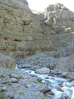 Verschiedene Erdschichten, darunter stark eisenhaltige, kann man schon zu Beginn der Bergstraße in der Schlucht Kotagil (nördlich des Weges) erkennen.