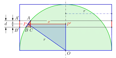Betrachten wir zwei horizontale Ebenen mit einem verschwindend kleinen Abstand voneinander, die die Oberflächen der Halbkugel und des Zylinders wie in der Abbildung schneiden. Der Radius des Schnittkreises der oberen Ebene mit der Halbkugel ist , und wir stellen uns als eine Zahl vor, die zwischen 0 und dem Radius liegt. Wir zeigen, dass die Mantelfläche des Elementarzylinders der Höhe gleich der Fläche ist, die durch die Drehung des Segments um die Achse erzeugt wird, d. h.