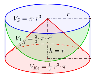 - Das Volumen einer Halbkugel ist gleich der Differenz der Volumina des umgebenden Kreiszylinders und des darin enthaltenen Kreiskegels gleicher Höhe und gleicher Grundfläche.