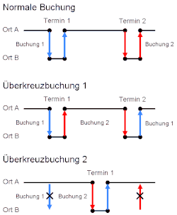 - Buchung 2: Hinflug Termin 1 A → B, Rückflug irgendein Termin 1 B → A (wird nicht angetreten),