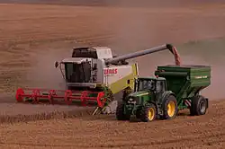 Überladewagen bei der Übernahme von Getreide vom Mähdrescher
