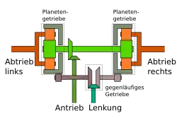 In der einfachsten Form sind die beiden Planetengetriebe parallel zu den Antriebsrädern nebeneinander angeordnet. Die Sonnenräder (inneren Räder) der beiden Planetengetriebe sind durch eine Welle fest miteinander gekoppelt. Diese Welle ist mit dem Motor des Fahrzeuges verbunden und überträgt die Antriebskräfte. Die beiden außenliegenden Treibräder (Antriebsräder) des Kettenlaufwerks sind mit den Planetenradträgern der beiden Getriebe starr (evtl. über ein zusätzliches Vorgelege) verbunden. Die beiden Hohlräder mit Innenzahnkränzen wirken jeweils über ein einfaches Stirnradgetriebe auf zwei Wellen, die über ein Kegelrad-Getriebe gekoppelt sind. Das zentrale Kegelrad besitzt einen eigenen Antrieb, der in der Regel als Hydraulikmotor ausgeführt wird. Der Hydraulikmotor wird über Hydraulik-Steuerventile angesteuert, die das von der Hydraulikpumpe geförderte Öl regulieren. Die Hydraulikpumpe wird vom Haupt-Antriebsmotor des Fahrzeugs angetrieben.
