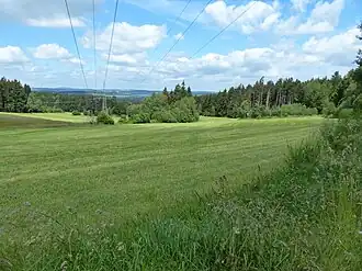 Lichtung im Hallersteiner Forst. Der Übermaßbach tritt von links ins Bild, an den Büschen unter der Hochspannungsleitung setzt seine Begleitgalerie ein. | ||