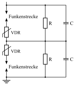 - Sie vereinen in Reihenschaltung eine Funkenstrecke und Varistoren. Die Reihenschaltung von mehreren Varistoren sind auf die zu schützende Nennspannung bemessen und begrenzen nach dem Überspannungsereignis den Netzfolgestrom über die Funkenstrecke so weit, dass diese aufgrund des Kathodenfalls selbsttätig verlöscht. Im Normalbetrieb sind die Varistoren aufgrund der trennenden Funkenstrecke stromlos.