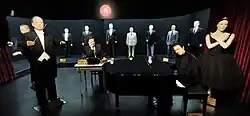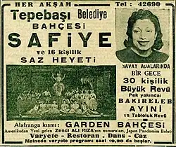 - In der in Istanbul 1949 aufgenommenen vokalinstrumentalen Fassung „Kâtibim“ auf dem Label Columbia wird Safiye Ayla, die zur Zeit der Aufnahme Ensemblemitglied am städtischen Konservatorium in Istanbul war, von einem Instrumentalensemble in heterophoner Musizierweise begleitet.[80] Das Booklet der von Klebe (2004) für ihre Analyse der Aufnahme verwendeten Tonträger-CD[A 8] gibt als Musikgattung „urban türkü“ und als Begleitinstrumente keman (in Quarten gestimmte europäische Violine), kanûn (Trapezzither), ud (Knickhalslaute ohne Bünde) und klarnet (europäische Klarinette in G, meist Albertsystem) an.[81] Die keinerlei Gesang enthaltenden Passagen enthalten zudem nicht sicher identifierbare Perkussionsinstrumente, deren rhythmisches pattern möglicherweise darbuka oder daîre zugeordnet werden kann.[82] Mustafa Kemal Atatürk hatte nach Auflösung des Osmanischen Reiches und der 1923 erfolgten Gründung der Republik Türkei (Türkiye Cumhuriyeti) den formellen Unterricht des klassischen osmanischen Musikrepertoires im Rahmen seiner reformistischen Modernisierungskampagne untersagt und die Musikkultur der Republik überwiegend an europäischen oder „westlichen“ Vorbildern orientiert,[40][83] wodurch es insbesondere in der bis dahin oral tradierten Volksmusik und teilweise auch in der Kunstmusik zu einem Abriss der Überlieferung gekommen war, so dass später lediglich schriftlich tradierte Werke rekonstruiert werden konnten.[83] Doch hatten kleine Ensembles als Manifestationen des früheren osmanischen ince saz („feines Orchesters“) diese Musikform und anderes beliebtes Repertoire weiterhin in den Nachtclubs und Cafés gespielt[40] und nach Erfindung und Verbreitung der Schallplatte und ihrer Produktion durch Musiklabels wie „Columbia“ oder „His Master’s Voice“ in den 1930er und 1940er Jahren erlangten einige Interpreten große Popularität,[83] wofür Safiye Ayla mit der 1949 von Columbia Records erfolgten Veröffentlichung ihrer historischen Aufnahme des Liedes „Kâtibim“ samt seiner Begleitung durch einen typischen ince saz aus Violine, kanun, ud und Klarinette beispielhaft ist.[40]