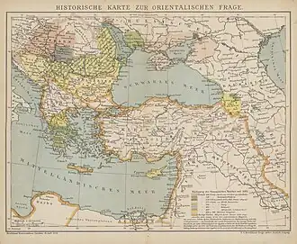 Legende: Braun: „Turanian“ (Türkisch-Sprecher ohne Lasen und Afscharen); Blau: Araber (dunkelblau: niedergelassene Lebensweise; hellblau: nomadische Lebensweise); Grün: Armenier; Gelb: Kurden.