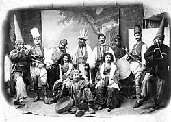 In Rumänien werden orientalische und Roma-Musikstile seit langem als sich überschneidende Phänomene wahrgenommen.[141] Vom 16. bis zum 19. Jahrhundert wurde in Rumänien osmanisch-türkische Kunstmusik gepflegt, zunächst vom Adel und später auch vom Bürgertum. Zu den frühen Interpreten dieser Musik gehörten osmanisch-türkische Janitscharen, die in mehterhanea genannten quasimilitärischen Ensembles spielten, deren Repertoire neben militärischen Liedern der Janitscharen auch osmanisch-türkische lyrische Stücke (manele, Singular: manea) beinhaltete. Lăutari (Singular. lăutar)[A 9], übernahmen während der osmanischen Zeit die Stile und Genres der türkischen Musiker und besetzten im 18. Jahrhundert die osmanisch-türkische Kunstmusik als ihre Domäne.[142]
