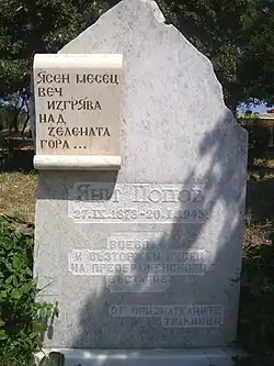 - Neben dem Liebeslied existiert die Melodie in Bulgarien auch als Hymne des 1876 begonnenen Aufstands gegen das Osmanische Reich im Strandscha-Gebirge („Ясен месец веч изгрява“; transliteriert: „Âsen mesec več izgrâva“, deutsch etwa: „Schon geht ein klarer Mond auf“).[105][120][121][122] Die berühmte Strandscha-Hymne „Ясен месец веч изгрява“ von Jani Popow (Яни Попов) wurde zum musikalischen Bild des Aufstands in der Strandscha-Region, der einen wesentlichen Bestandteil des Ilinden-Preobraschenie-Aufstands von 1903 darstellt,[123] der wiederum in Bulgarien als Höhepunkt im nationalen Befreiungskampf der mazedonischen und thrakischen Bulgaren wahrgenommen wird.[124] In dem Lied erzählt Popow von einer Schlacht, die eine kleine Gruppe komiti (комити, Mitglieder eines revolutionären Komitees) mit osmanischen Truppen am 2. April 1903 im Dorf Сърмашик (Sʺrmašik, heute Бръшлян/Brʺšlân) anführte und bei der die beiden Woiwoden Пано Ангелов (Pano Angelow) und Никола Равашола (Nikola Rawaschola) zu Tode kamen. Popow, selbst ein Anführer des Preobraschenie-Aufstands, schrieb den Originaltext 1904 unter Feldlagerbedingungen in der Strandscha und veröffentlichte das Lied im Jahr 1909, damals noch unter dem Titel „За Пано и Равашола“ („Za Pano i Ravašola“; deutsch: „Für Pano und Rawaschola“), in seiner Sammlung „Странджански жалби“ („Strandžanski žalbi“). Laut der Journalistin Росица Попсавова (Rosica Popsavova) wurde das Lied Erinnerungen der alten Einwohner Brʺšlâns zufolge 1908 öffentlich im Dorf gesungen.[119] 1953 wurde die Melodie erstmals auf Радио София (Radio Sofia) von dem im Dorf Brʺšlân geborenen Volksliedsänger Сава Попсавов (Sava Popsavov) gesungen, ein Jahr vor dem Tod Popows.[119][125] Besonders bekannte bulgarische Interpreten dieser Hymne sind Sawa Popsawow und Slawi Trifonow.