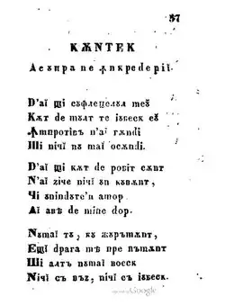 - Das rumänische Lied „De-ai ști suflețelul meu“, bei dem es sich um eine mögliche Variante von „Üsküdar’a Gider İken“ aus dem türkischen Repertoire oder von „Από ξένο τόπο“ aus dem griechischen Repertoire handelt, ist ein Beispiel für die ursprünglich aus dem griechischen oder türkischen Repertoire stammenden musikalischen Kreationen, die die Liedersammlung „Spitalul amorului“ (1. Auflage 1850, 2. Auflage 1852) von Anton Pann enthält, und die nach Übersetzung und melodischer Adaption in das Repertoire von Gelegenheitsinterpreten und rumänischen Lăutari übernommen wurden.[143] Noch bis Mitte des 19. Jahrhunderts, als die Herrschaft der von den Osmanen eingesetzten griechischen Phanarioten bereits zu Ende gegangen war und westliche Musik die städtische Kultur Rumäniens durchdrungen hatte, blieb die „orientalische“ (türkische) Musik in der rumänischen Kultur verankert und der orientalische oder türkische Musikstil eng mit dem Roma-Stil wie dem der lăutari verbunden. Die Vielfalt der damals populären Musik mit ihrer Mischung aus „orientalischen“ und „abendländischen“ Musikstilen spiegeln die von Anton Pann ab 1830 zusammengetragenen Lieder wieder.[144]