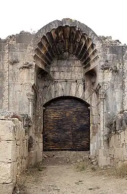 Vom Hof betritt man den gedeckten Teil über ein weiteres Portal, das in der gleichen Achse wie der Hofeingang liegt. Der Innenraum besitzt in Nord-Süd-Richtung ein höheres Mittelschiff mit je zwei Seitenschiffen rechts und links. In Querrichtung ist der Raum in sieben Schiffe aufgeteilt. Im vierten Querschiff war das Gebäude vermutlich von einer zentralen Kuppel überkrönt, von der allerdings nichts erhalten ist, da das Tonnengewölbe des Mittelschiffs teilweise eingestürzt ist. Neben anzunehmenden Fenstern in der Kuppel wurde der Innenraum von je sieben Schlitzfenstern in den Längswänden und einem in der hinteren Wand beleuchtet. Die Außenwände werden durch acht Türme verstärkt, je zwei an den Außenwänden und zwei an den nördlichen Ecken. Die Türme haben unterschiedliche Formen, von quadratisch über polygonal bis rund.