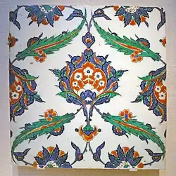 Doch auch Gefäß- und Gebrauchskeramik wurde verstärkt nachgefragt. Vor allem bei großen Tellern wurde der Dekor in der Komposition nun freier, lockerer und naturalistischer, Schiffe, Tiere, Bäume, Blumen und Symbole wie Chintamani bildeten die Motive. Viele der Teller scheinen zur Wanddekoration verwendet worden zu sein; sie weisen Fußringe auf, an denen sie aufgehängt werden konnten, doch sind zugleich bei vielen Schalen Gebrauchsspuren nachgewiesen worden.[16] Seit 1520 dominierte der Saz-Stil mit seinen langen, gezahnten, dynamisch arrangierten Blättern, die von statischen Rosetten ausbalanciert wurden. Im späteren 16. Jahrhundert setzte sich der Quatre-Fleurs-Stil mit seinem Repertoire aus stilisierten Rosen, Nelken, Tulpen und Hyazinthen durch, die fortan die Hauptmotive türkischer Keramik bildeten.