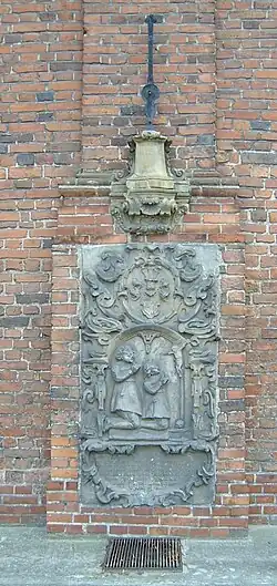 An der Nordseite der Kirche befindet sich das älteste Grabdenkmal des Ortes. Es stammt von 1639 und ist eine etwa zwei Meter hohe Sandsteinplatte. Diese trägt die Inschrift „DOM“ (für „Deo Omnipotenti Maximo“ – dem allmächtigen Gott). Darunter stehen rechts die Worte „D. Lisieckich“ und links „D. Radowickich“. Zwischen diesen Worten befindet sich das Wappen der Grzymała. Unter diesem Wappen befindet sich ein Relief zweier vor einem Kreuz kniender Kinder. Der Text, der sich darunter befindet, lautet auf Deutsch: „Maciej und Mikołaj Radowicki, zwei Brüder, haben im Alter von dreieinhalb und zweieinhalb Jahren, der ältere am 11. und der jüngere am 12. Mai 1639, dem Tode ihren Zoll entrichtet und wurden hier in einem Grabe beigesetzt. Ihnen haben die trauernden Eltern Maciej Radowicki aus Klein Radowick, Woiwodschaft und Kreis Kulm, und Sofia Lisiecka aus Koszew in Liebe diesen Grabstein zum ewigen Gedächtnis gesetzt“.[15]