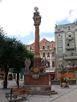 - Die Dreifaltigkeitssäule vor dem Rathauserker, deren Schöpfer nicht bekannt ist, wurde 1693 vom Schweidnitzer Landeshauptmann Johann Joachim Michael von Sinzendorf gestiftet.