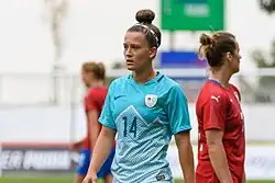 Ihr Debüt in der A-Nationalmannschaft gab sie am 14. Juni 2014 in Domžale bei der 1:2-Niederlage gegen die Nationalmannschaft Russlands im siebten Spiel der WM-Qualifikationsgruppe 1 mit Einwechslung für Anja Milenković in der zweiten Minute der Nachspielzeit.[8] Es war zugleich ihr erstes von insgesamt 19 WM-Qualifikationsspielen, in denen sie sich einmal zu den Torschützen zählen (lassen) konnte. Zwei Spiele und sechs Tore mehr verbuchte sie in ihren EM-Qualifikationsspielen, die sie im Zeitraum vom 22. September 2015 (0:3 vs. Schottland) bis zum 29. Oktober 2024 (1:2 vs. Österreich)[9] bestritten hatte. Ihr erstes A-Länderspieltor erzielte sie am 21. Januar 2019 beim 4:0-Sieg im Freundschaftsspiel gegen die Nationalmannschaft Montenegros mit dem Treffer zum 2:0 in der 52. Minute.[10] Es gelang ihr in ihrem 23. A-Länderspiel, zugleich in ihrem sechsten von (gegenwärtig) 14 Freundschaftsspielen. Des Weiteren nahm sie mit ihrer Mannschaft an drei unterschiedlichen Turnieren teil. Zunächst wurde sie in allen drei Spielen der Gruppe B im Turnier um den Istrien-Cup 2016 eingesetzt, drei Jahre später in zwei Spielen der Gruppe A und im Finale, das mit 2:0 gegen die Nationalmannschaft Serbiens gewonnen wurde. Im Spieljahr 2023 war sie mit ihrer Mannschaft Gast in der Türkei und wurde in Alanya in drei Spielen um den Turkish Women’s Cup eingesetzt (2:1 vs. Usbekistan am 15., 1:0 vs. Sambia am 18., 1:1 vs. Südafrika am 21. Februar). In Spanien in San Pedro del Pinatar vor Ort wurde sie im Februar in zwei Spielen um den Pinatar Cup 2024 berücksichtigt. Bislang zehn Länderspiele (1 Tor) bestritt sie in den Wettbewerben der UEFA Women’s Nations League (6 Spiele Gruppe 4, Liga B und 4 Spiele Gruppe 2, Liga B).
