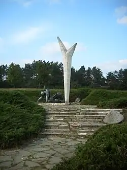 Das Denkmal für den Widerstand und die Freiheit markiert ein Massengrab des Massakers vom Oktober 1941, welches sich an dieser Stelle befindet. Es besteht aus einem etwa 12 Meter hohen Betonobelisken, dessen Ende sich aufgabelt, sowie einer Bronzestatue. Der Obelisk weist Ähnlichkeiten zum lateinischen Buchstaben V auf, welcher für Victory (englisch für Sieg), also den Sieg der Partisanen über den Faschismus stehen könnte.