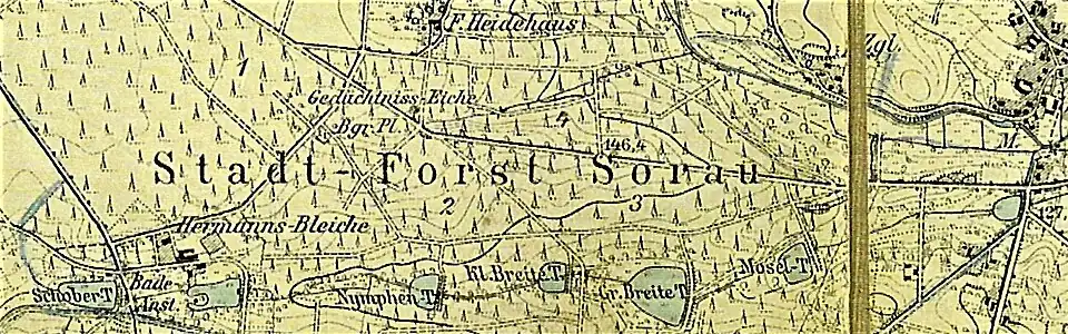 - ↑ Willi Lufft: Um Hermanns Bleiche und die sieben Teiche: Der 1000 Morgen große Sorauer Stadtforst, Vor dem Sorauer Niedertor um 1860 und später. Hrsg.: Sorauer Heimatbrief. 1956, S. 10.