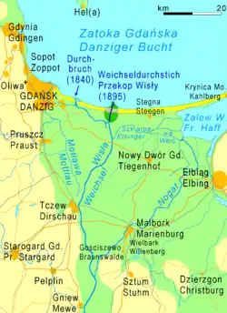 Die Danziger Weichsel folgte dem Urstrom und mündete nahe der Stadt Danzig (Gdańsk) in die Danziger Bucht (Zatoka Gdańska). Im Jahre 1840 entstand bei einem Hochwasser der Weichseldurchbruch auf halbem Wege zwischen der Gabelung und Danzig. Der neue Weichselarm erhielt den Namen Kühne Weichsel (Wisła Śmiała), der alte Arm versandete zunehmend. In den Jahren 1889 bis 1895 wurde dann bei der Gabelung die Nehrung durchstochen, um die Hochwassergefährdung des Weichseldeltas zu vermindern. Seit der größte Teil der Stromweichsel (Leniwka) durch diesen Weichseldurchstich (Przekop Wisły) in die Ostsee strömt, wurde die Versandung der Danziger Weichsel durch eine Schleuse verhindert. Sie erhielt den Namen Tote Weichsel (Martwa Wisła).